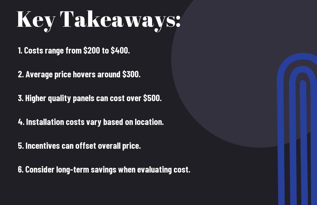 - Average price: On average, a full-sized solar panel can cost anywhere from $150 to $400 per panel, with higher-end panels costing even more.